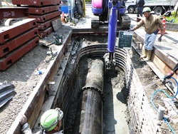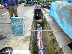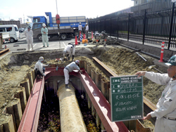 下水道管埋没工事とは下水道本管を土の中に埋めていく土木作業です。工事を始める前に周囲の環境を十分に調査することが欠かせません。また、場所や条件によって違う施工方法が用いられますが、開削工法と推進工法がメインになります。 |